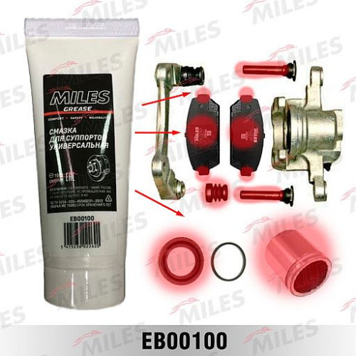 Смазка для суппортов (MILES EB00100) в упаковке 100 гр. Высокотемпературная смазка для тормозных систем автомобилей обеспечивает подвижность деталей суппорта, равномерный износ колодок, устраняет скрип тормозов. MILES EB00100