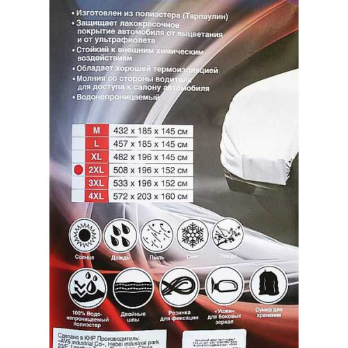 Водонепроницаемый тент джип габаритов 508х196х152 см. Защищает автомобиль от пыли, дождя, солнца, снега, птичьей неожиданности