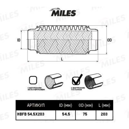 Гофра глушителя (виброкомпенсатор) 54.5X203мм InnerBraid MILES HBFB54.5X203